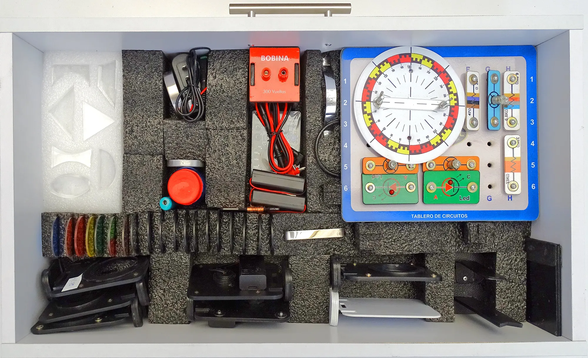 A continuación, se detalla el contenido del Laboratorio didáctico integrado Básico, organizado por elementos y cantidades. Este completo set de materiales está diseñado para realizar actividades prácticas en biología, química y física con seguridad y eficiencia en el aula